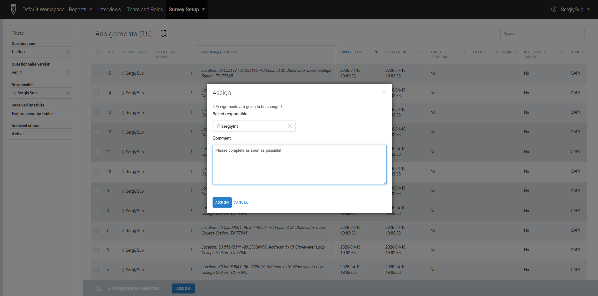 Reassigning an assignment from an interviewer back to the supervisor removes it from the interviewer’s tablet at the next synchronization.