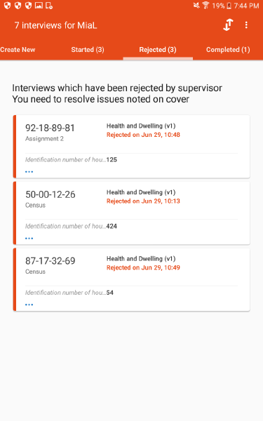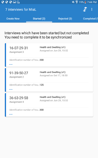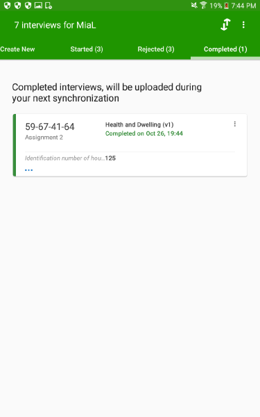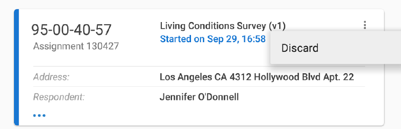 If for some reason, you need to discard an incomplete interview, you can tap on the 3 vertical dots on the upper right corner, and then on the Discard button on the interview’s card after finding the interview in the Started tab. You will be asked to confirm that you want to delete the interview. Tap on “Yes” to confirm and interview will be discarded. BE CAREFUL WHEN DISCARDING AN INTERVIEW, THE INFORMATION FOR THAT INTERVIEW CANNOT BE RECOVERED ONCE DISCARDED.