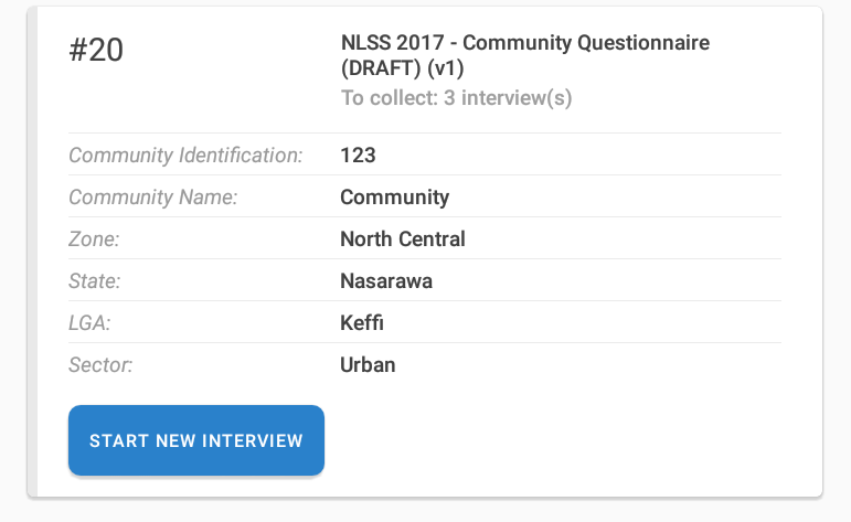 The card for each assignment will have a number at the top. This number will correspond to the assignment number that Headquarters and Supervisors user will also use to identify the assignment. Next to the assignment number will be the number of interviews that remains to be completed by the interviewer. This number will decrease as the interviewer completes more interviews.