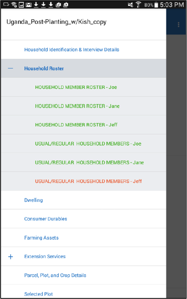 The second, which concerns completeness, is to use the navigation panel as a gauge of whether any questions still need to be answered. Each element in the navigation panel is color-coded. Green indicates that a section is complete—that is, that all questions have been answered and none have invalid answers. Blue denotes incomplete—that is, that some question are unanswered. Red indicates that one or more questions in the answer have an invalid answer—that is, an answer that violates the validation condition.