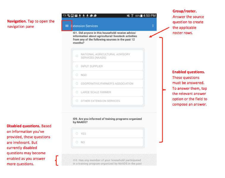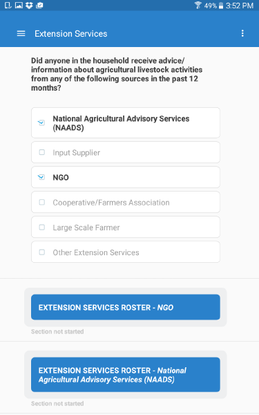 An interviewer must complete a roster row by row. By tapping on the button associated with any given row, the interviewer will see all questions for that item in the roster. To move back to the roster view, click on the button at the bottom of the screen (e.g., Extension Services).