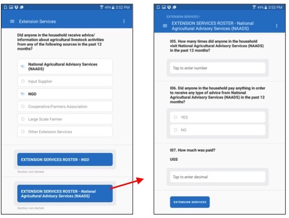 An interviewer must complete a roster row by row. By tapping on the button associated with any given row, the interviewer will see all questions for that item in the roster. To move back to the roster view, click on the button at the bottom of the screen (e.g., Extension Services).