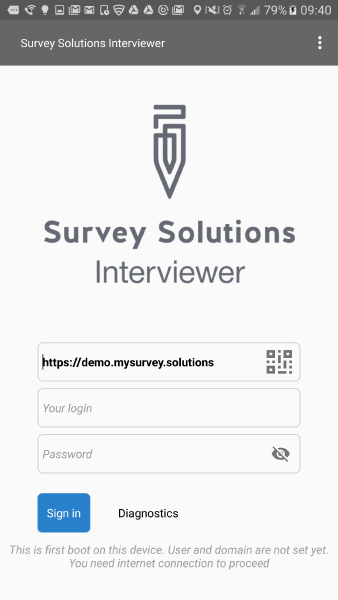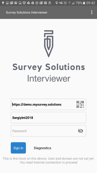 Typing in the server address may be time consuming and prone to errors, so to simplify the process Survey Solutions permits entering this information by scanning a barcode. This is especially useful for the ITs setting up a large number of tablets in the office for many interviewers at the start of the survey.