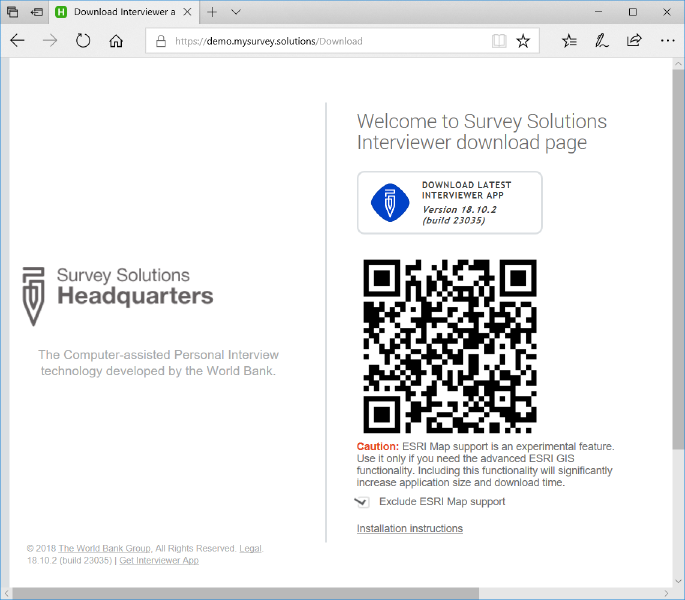 These QR-codes are displayed on the Interviewer App download page. If the Interviewer App has not been installed yet on the tablet, we can quickly navigate to the server page by scanning such a QR-code with any qrcode scanner that might be already installed on the tablet, and then download the Interviewer App.