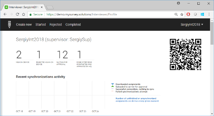 The second kind of QR-codes shown by Survey Solutions contains the address of the server and the interviewer account name and is displayed at the interviewer profile page: