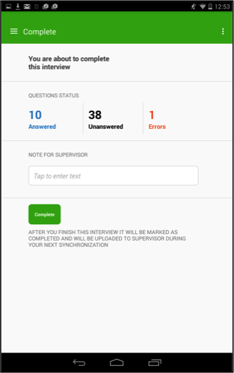 To complete the interview, click on the button on the top left of the screen and click on the Complete button at the bottom of the menu. You will see a summary screen. The number next to the Unanswered button indicates how many questions have been left unanswered. Similarly, the Errors button provides the number of questions with invalid answers. You can write in the Note for supervisor field any comments or observations that you would like to share with your supervisor. When you are sure that the interview is completed, press Complete to finish it and return to the Dashboard, where you will be able to select another household and start a new interview.
