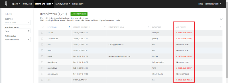 For Headquarters and Supervisor users, the Teams and Roles > Interviewers tab provides a report of which version of Interviewer each interviewer is using. If application used is old, the cell in the APP VERSION column will appear in red.