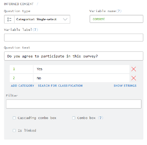 - Define the classification’s categories in the right-hand pane, either by clicking on ADD CATEGORY to add categories one-by-one or by clicking on SHOW STRINGS to paste a properly formatted set of answer options