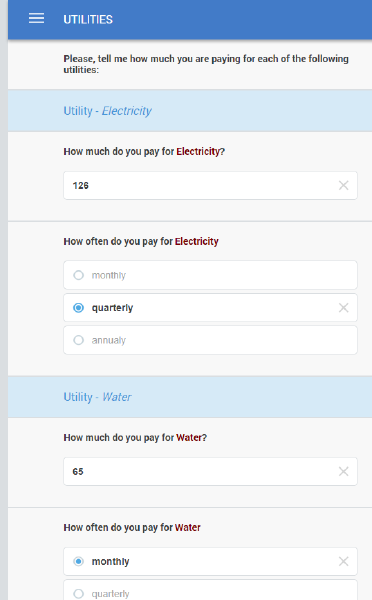 In the example below a roster of expenditures on utilities containing questions on the amount and frequency for each utility consumed is presented in plain mode.