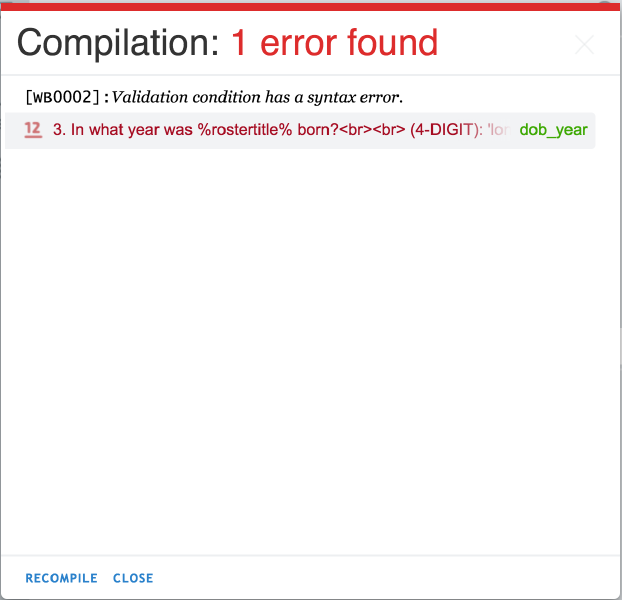 If errors are found, a red text Errors with the number of errors will display, along with a pop up window with the list of errors and the corresponding links to their location within the questionnaire. If you dismiss the list of errors window, you can access it again by clicking on the Errors link.