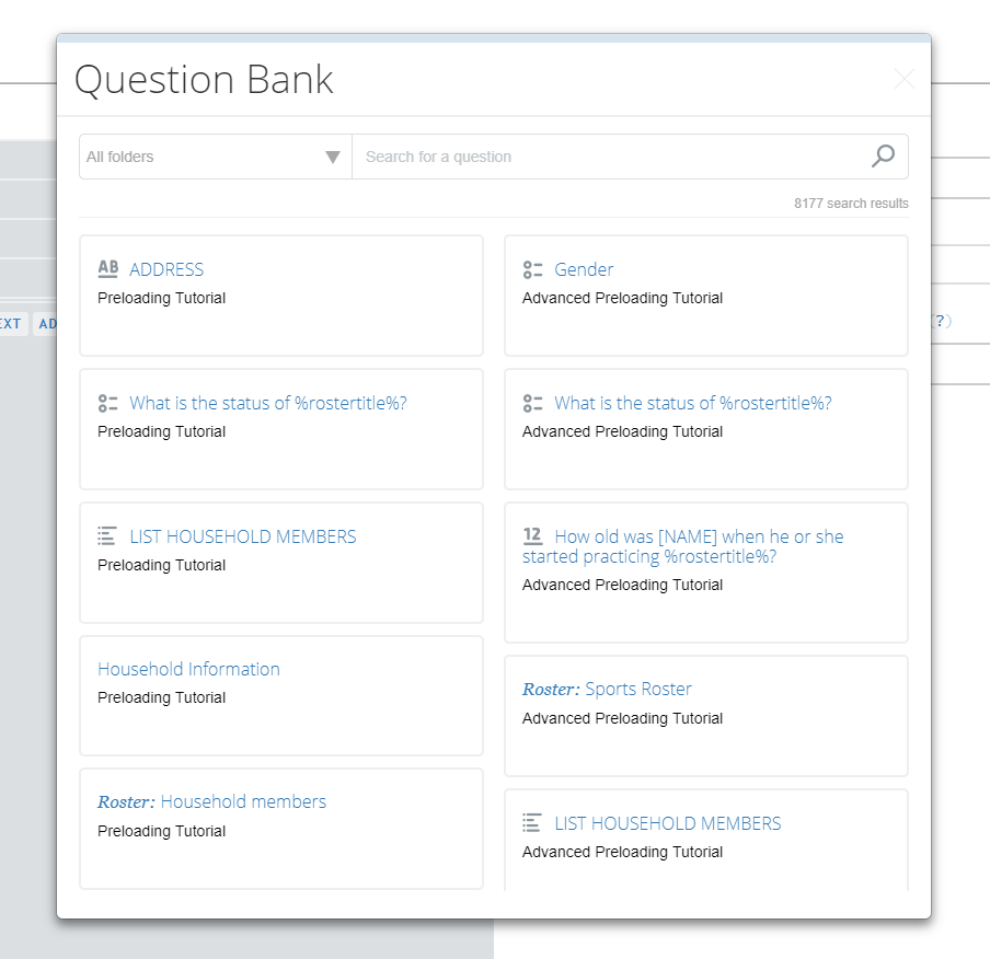 In the image above, the first search result is a text question, with question text “ADDRESS”, from the questionnaire named “Preloading Tutorial”.