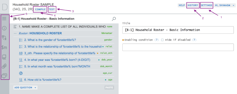 - History. Keeps the record of all recent changes made to the questionnaire, with the corresponding username and timestamp