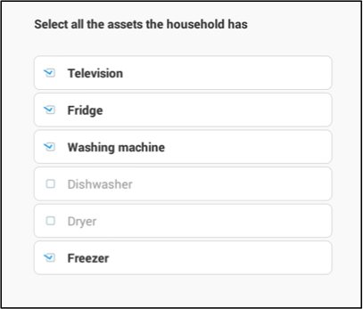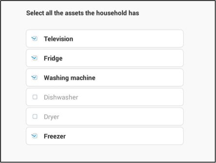 multi-select question on the presence of various assets in the household