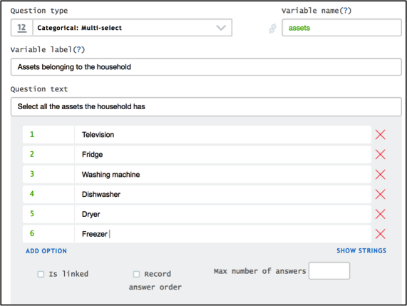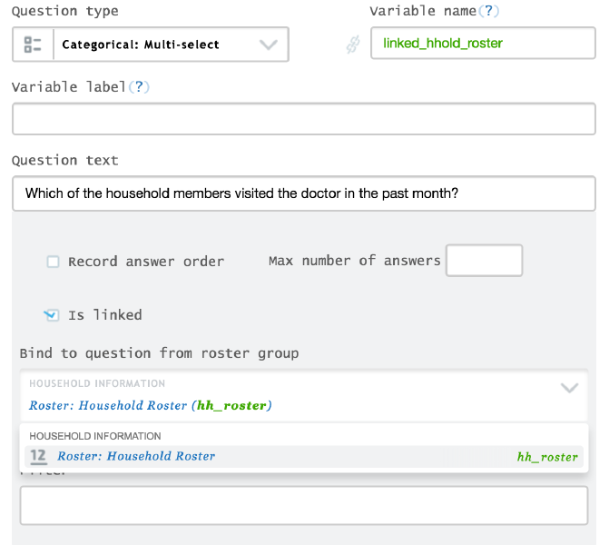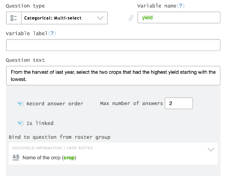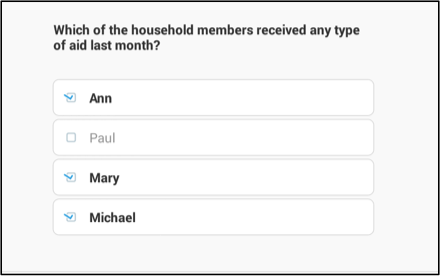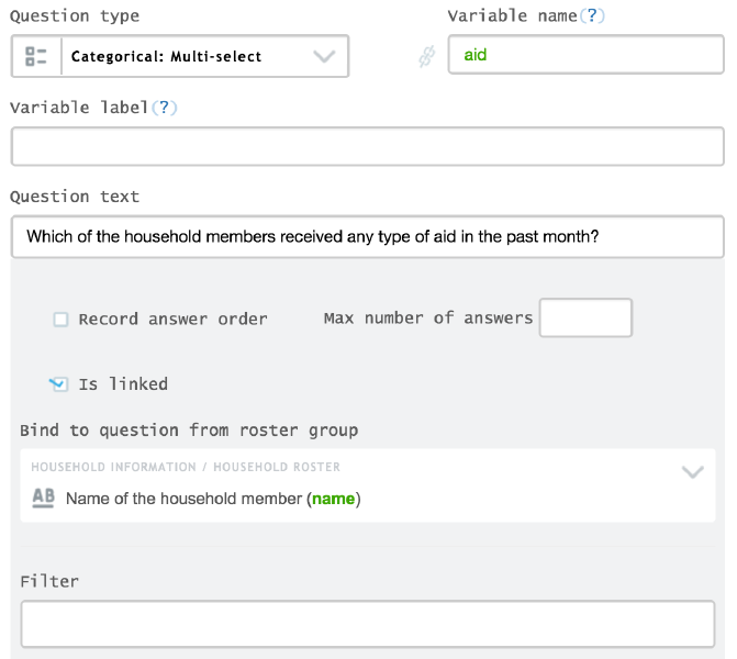You can also link a categorical: multi-select **** question to a previous roster or question (text, numeric, or date) in a roster. Imagine a survey that collects information about the type of aid a population group has received. For this study you are interested to know which individual in the household has received some type of aid, in order to see if there is a connection to certain information, such as age and/or gender. As you foresee that more than one household member may have received aid, you can create the question “Which of the household members received any type of aid last month?” This question will be a categorical multiple-answer question linked to a household list roster.