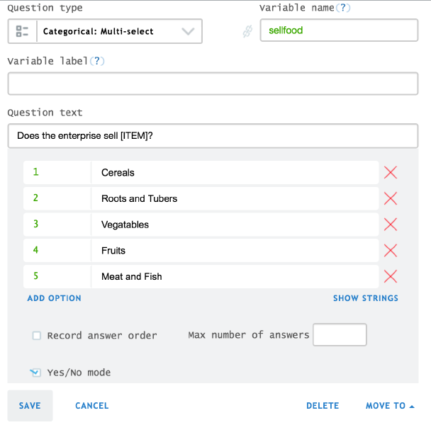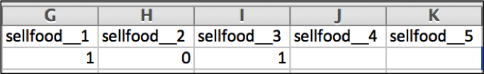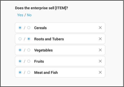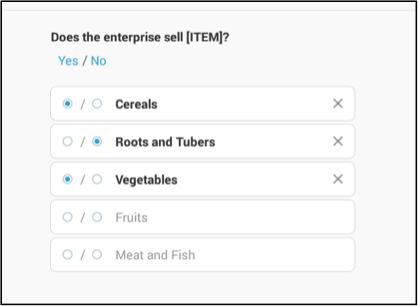 The second example refers to the question: “Does the enterprise sell [ITEM]?” where codes from 1 to 5 represent: cereals, roots and tubers, vegetables, fruits, and meat and fish respectively. The enumerator selects “yes” or “no” for each of the categories listed.