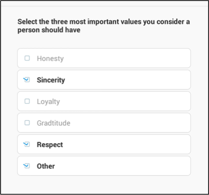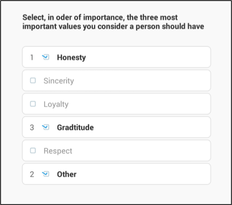 When the enumerator begins selecting options, sequential numbers (starting from one) will be displayed to the right of each selected category. In this example, the enumerator selected Honesty first, followed by Other, and then Gratitude lastly.