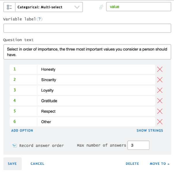 The next example illustrates a categorical: multi-select question that expects a maximum of three categories to be selected and ordered by a criterion. In this example, the question is: “Select, in order of importance, the three most important values a person should have” where codes from 1 to 6 represents: honesty, sincerity, loyalty, gratitude, respect and other respectively.