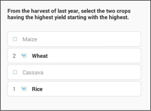 The system assigns the codes: 1 to Maize, 2 to Wheat, 3 to Cassava and 4 to Rice. The enumerator does not see this coding. However, they see the numbers indicating the order in which each category was selected.