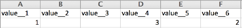 The last example shows the data exported from a linked categorical: multi-select question that expected a maximum of two selected categories and the order in which the categories were selected to have been preserved. In this example, the question: “From the harvest of last year, select the two crops that had the highest yield starting with the lowest.” is linked to the question: “Name crops that you harvested last year". Let’s imagine that the answer to the latter was: Maize, Wheat, Cassava and Rice. The system automatically creates the codes: 0,1,2 and 3 for each crop respectively. If the crop with the highest yield was Rice and the second one was Wheat, the system exports the values 3 and 1.