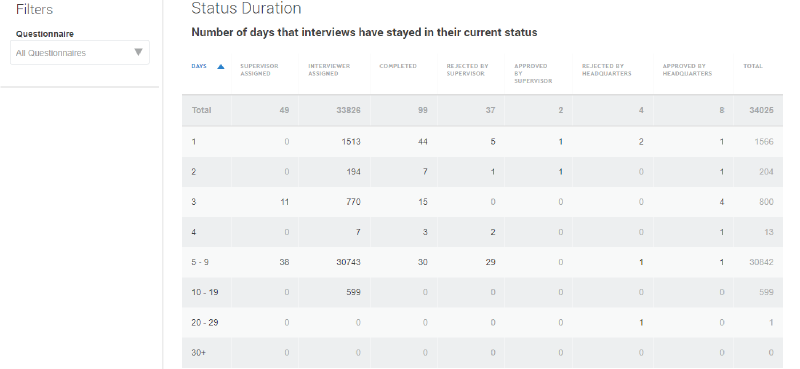 While most reports show survey progress, the Status Duration report carefully flags lack of progress. By seeing how many days interviews stay in the same status, survey managers can see whether survey operations are moving forward, and identify any bottlenecks (e.g., slow approval by supervisors, slower reactions by HQ, etc.) .By clicking on any cell in the report, managers can drill down to the details of which questionnaires and/or field staff are behind interviews stagnating in the same status.