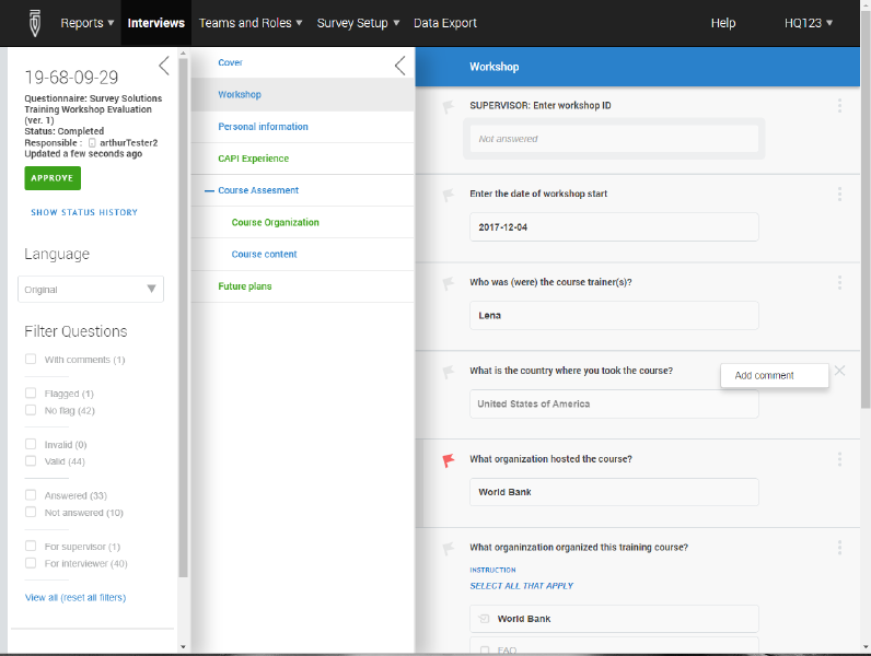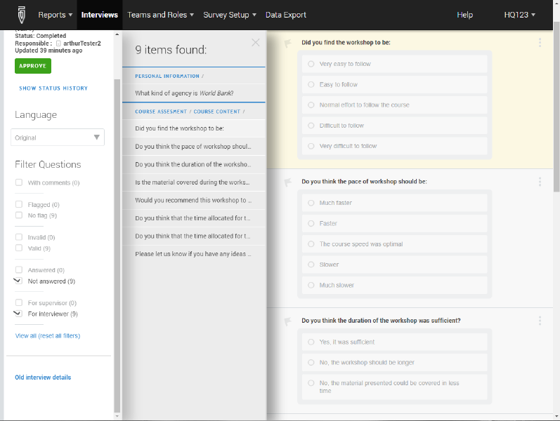 Second, the user interface has been made more powerful by the introduction of filters. In the left-most pane, Headquarters and Supervisor users may filter interviews in order to focus on content of interest by ticking on the corresponding box(es) (e.g., supervisor questions, flagged questions that are also invalid, etc.). When used, filters query the questionnaire for questions of interest, and yield a list of results in the middle pane. Clicking on a result has the effect of moving to that result and its context in the questionnaire.