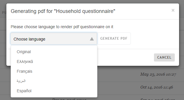 Now, users may select the export language for the PDF file form a drop-down menu of translations defined for that questionnaire. To do this, export the PDF as usual, select a language from the drop-down menu of translations, and click on GENERATE PDF to download the file.