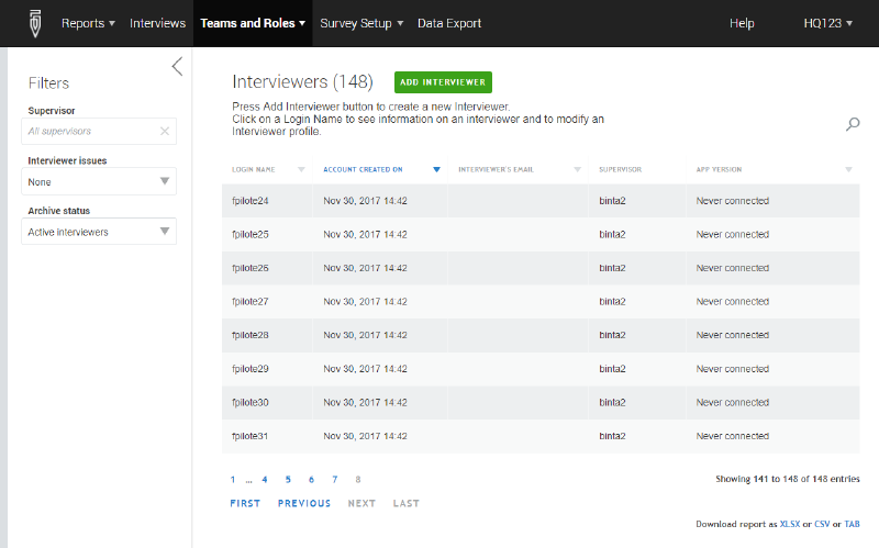Now, Survey Solutions combines those two reports into a single, exportable one. To export that report, navigate to Teams and Roles > Interviewers, scroll to the bottom of the screen, and click the desired file format.