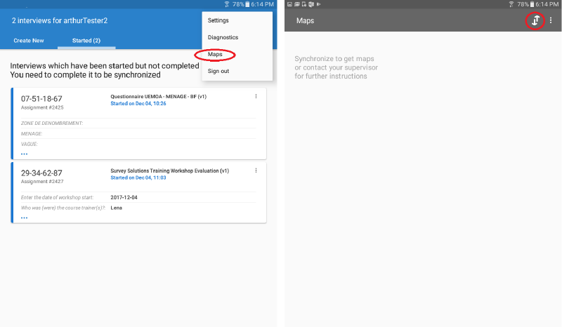 - Navigate to the map synchronization screen. From the Interviewer dashboard, tap on the overflow menu. Then, select maps. From the maps screen, tap on the sync button.