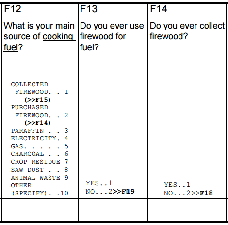 Often, it is easier to say what should not be, rather than what should be. Consider the following example. Follow-up questions about firewood use are asked only if the household does not use firewood as its main source of cooking fuel.